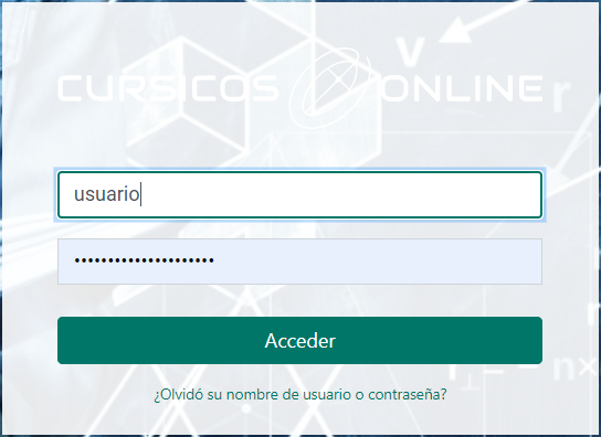Introduce el usuario y contraseña que habrás recibido en el correo electrónico que facilitaste a la hora de registrarte en Cursicos Online y, a continuación, haz click de nuevo en acceder.